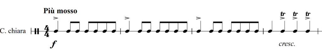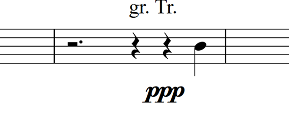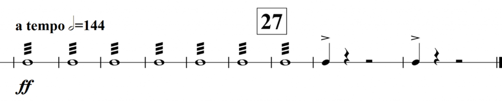 We can clearly see that the bass drum phrase ends at figure 119 (more on this will be discussed on the article dealing with the bass drum part) and, as always, Orff writes the indication for the new instrument BEFORE it makes its entrance: