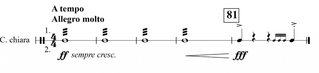 The percussion score, carelessly written, indicates, due to a system change, to play both snare drums together one bar later than it should really be (three bars before figure 81 instead of four). That is an obvious misprint which is easily solved using musical and common sense (be ready, those of you who stubbornly play the ink!). The manuscript and the conductor score correctly indicate both drums to play a due since A tempo. Allegro molto.